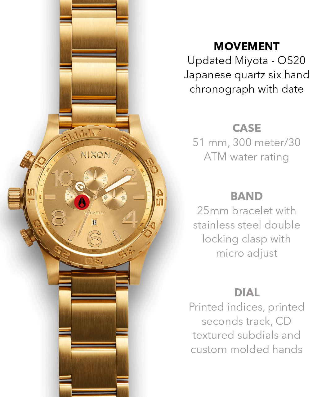 The Nixon 51-30 Chrono is technically not 100% waterproof. But that doesn't mean it can't be worn in the water! It has a water resistance rating of 300 meters / 30 ATM, meaning it is pressure tested to 300 meters.