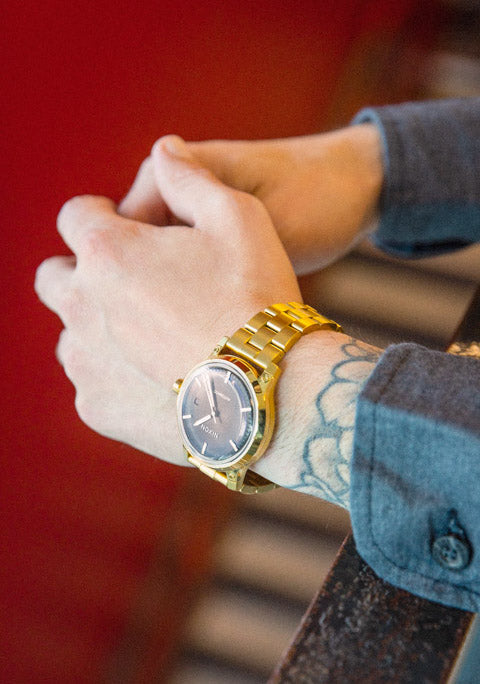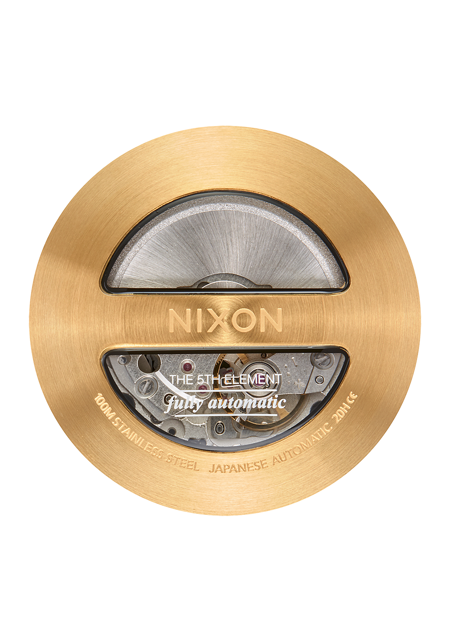 The unique two-piece design eliminates the need for a traditional caseback, while the split window gives a view of the inner workings of the automatic movement and the custom crystal shape flows seamlessly into the case with angled edges. The domed dial features LUME block indices and LUME accents on the hands for visibility even in low light conditions.