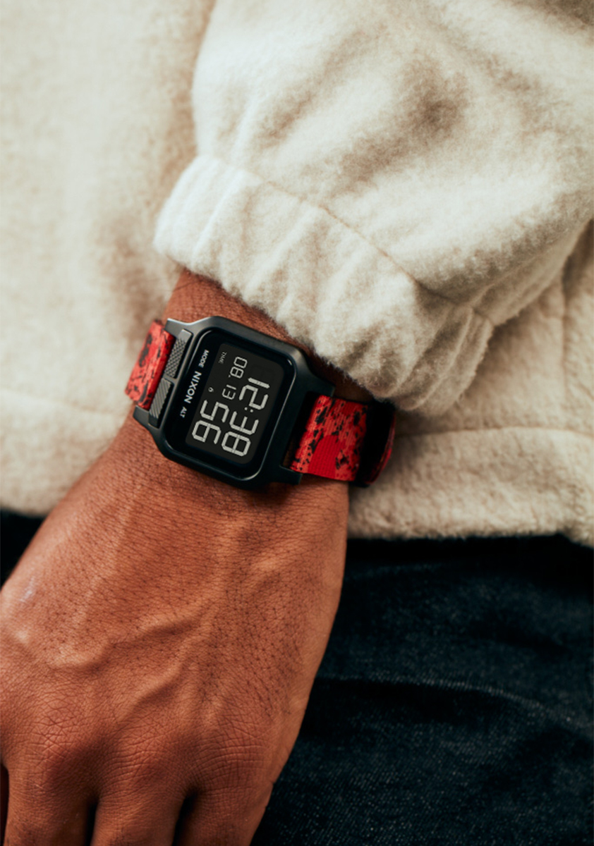 The Nixon Heat watch offers athletes and surfers multiple timer options, a chronograph, and a Final Countdown timer with a 60-second SEND notification to enhance performance during training sessions. Additionally, it features a custom LCD module and a rugged yet slim design to withstand rigorous conditions.