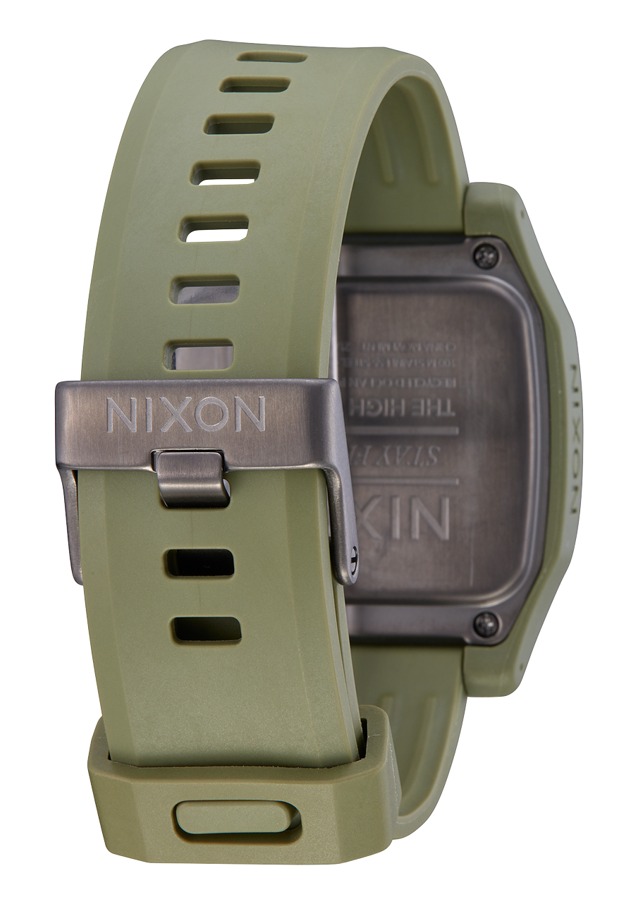 The Nixon High Tide watch is designed to be highly comfortable and durable. The strap is a rubber blend that is injection-molded for maximum wearability and secured by a double-locking looper. This design, similar to a high-quality wetsuit, supports both daily wear and use under wetsuits, providing a comfortable fit during surfing activities with its 100 meter / 10 ATM water rating.