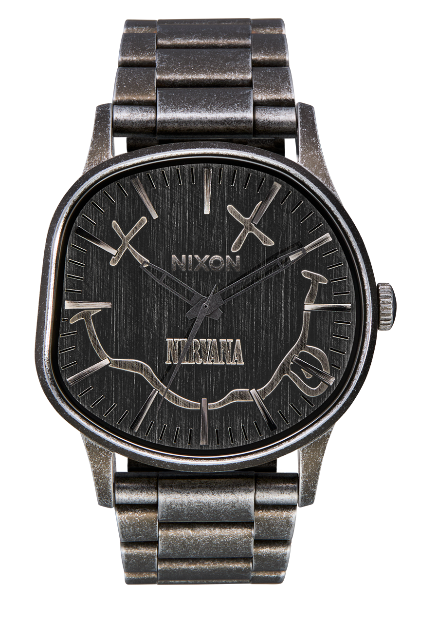A band of this magnitude deserves a watch like no other. The Nirvana collection features the Sentry Wobble, a case bent to fit the shape of their iconic smiley face graphic. Accompanying the Wobble is the Sentry Leather with a fuzzy sweater-like feel to the band and a polarizing sun-ray dial with angled Nirvana letters as the indices. Lastly, the Time Teller's minimal profile packs a punch with a hit of a black-on-black smiley face and yellow Nirvana logo and text style.