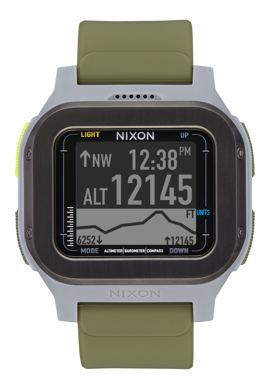 Custom digital module with high resolution MLCD with front light. Functions include altimeter, barometer, compass, thermometer. Camp mode with weather alert, session mode with runs tracker, dual time zones in 12 or 24 hr format, date, chronograph, and alarm.