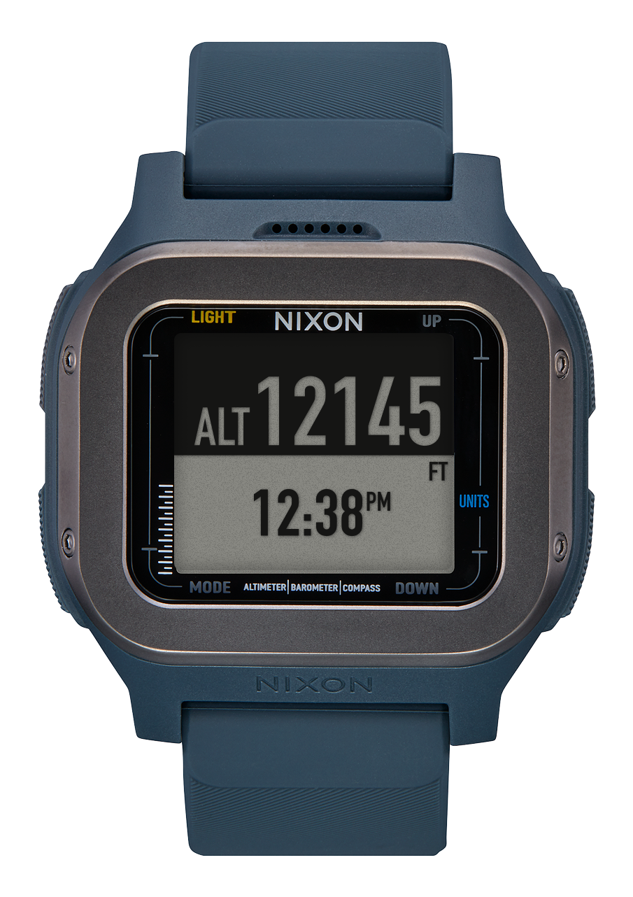 Custom digital module with high resolution MLCD with front light. Functions include altimeter, barometer, compass, thermometer. Camp mode with weather alert, session mode with runs tracker, dual time zones in 12 or 24 hr format, date, chronograph, and alarm.