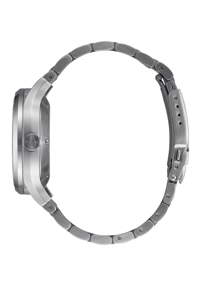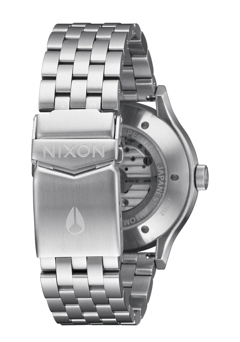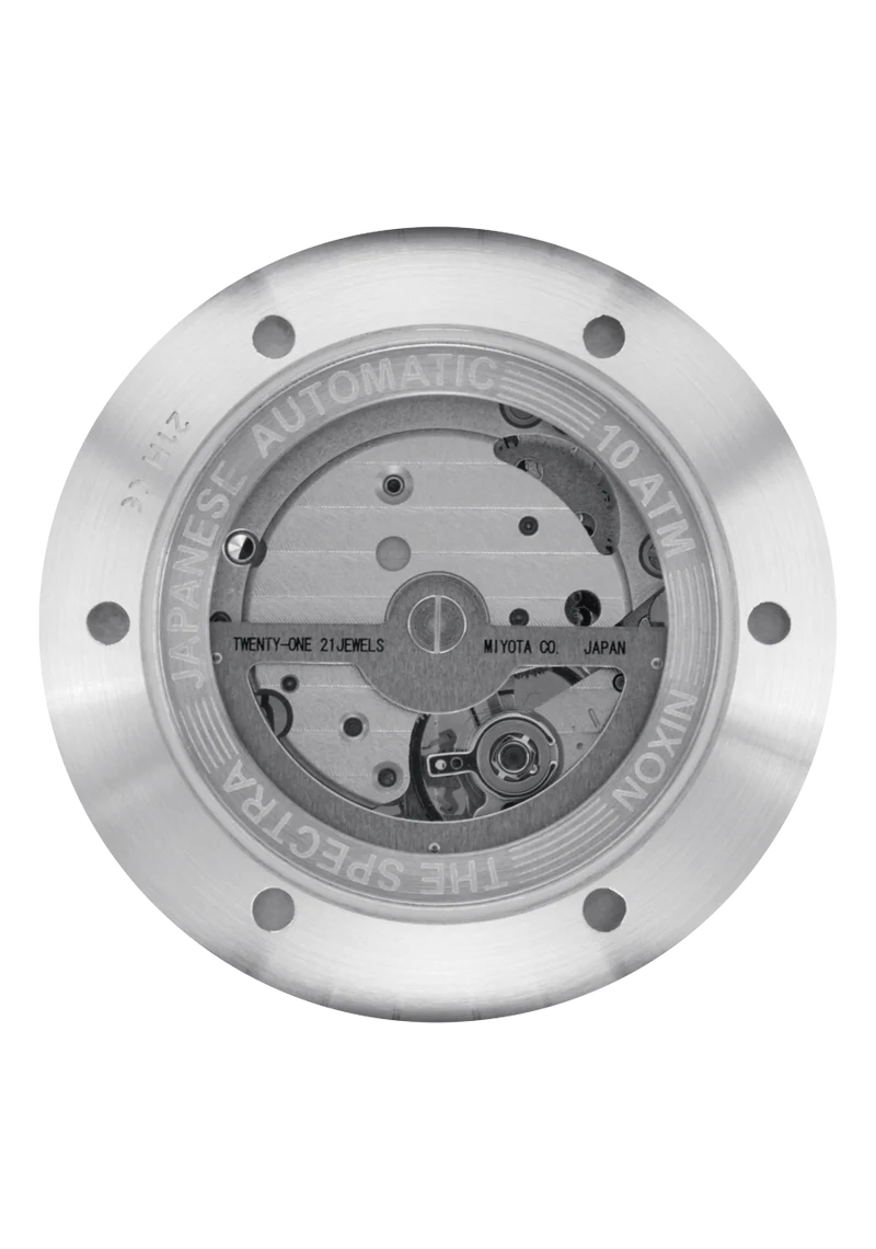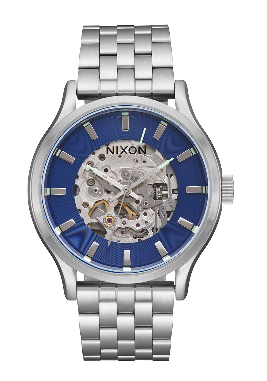 Exhibition dial exposes the automatic watch movement. The dial features applied, dimensional stick indices. The Nixon wordmark is applied to the underside of the watch crystal for additional dimension.
